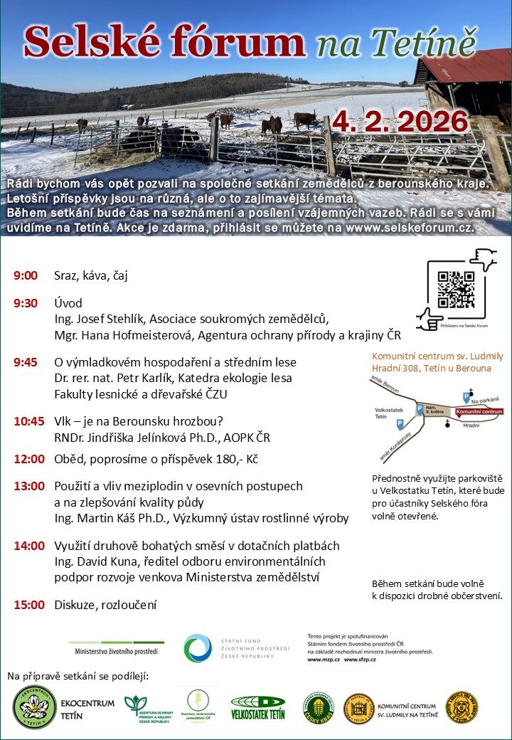 Během setkání bude čas na seznámení a posílení vzájemných vazeb. Rádi se s vámi uvidíme na Tetíně. Akce je zdarma, přihlásit se můžete na wwww.selskeforum.cz.